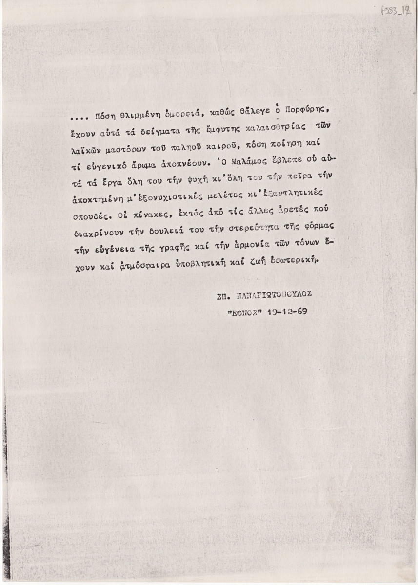 Φωτοαντίγραφο κειμένου, στα ελληνικά, δακτυλόγραφο, χαρτί, 29,8×21,0 εκ. Απόσπασμα κριτικής του Σπ. Παναγιωτόπουλου για το έργο του Κώστα Μαλάμου.