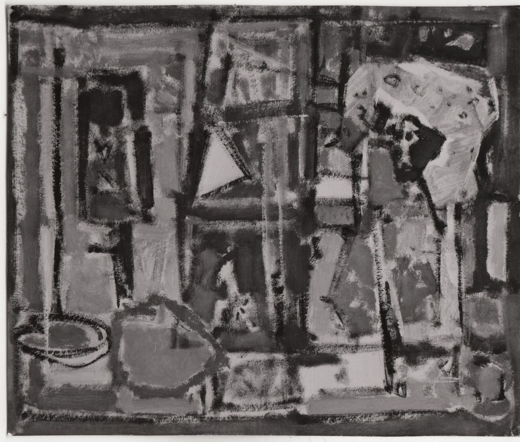 Φωτογραφία, α/μ, φωτογραφικό χαρτί, 12,0×14,3 εκ. Αναπαραγωγή έργου του Γιάννη Σπυρόπουλου, 1957. Στην πίσω όψη, σημείωση με τα στοιχεία χρονολόγησης.