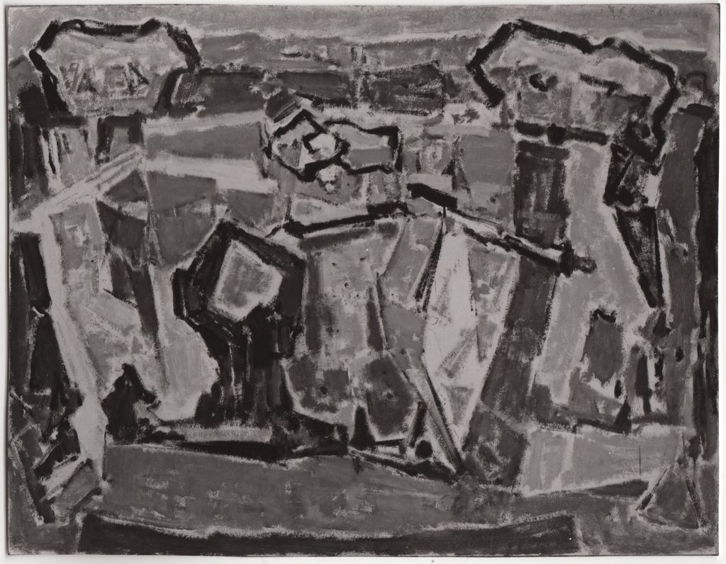 Φωτογραφία, α/μ, φωτογραφικό χαρτί, 11,7×15,0 εκ. Αναπαραγωγή έργου του Γιάννη Σπυρόπουλου, 1957. Στην πίσω όψη, σημείωση με τα στοιχεία χρονολόγησης.