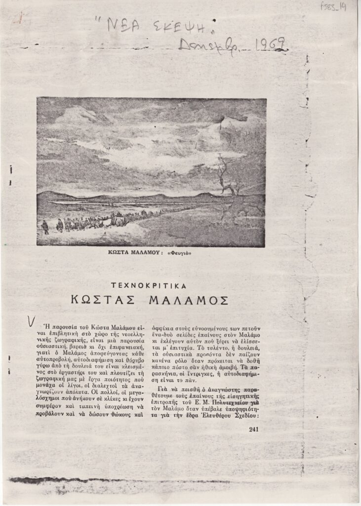 Φωτοαντίγραφο αποκόμματος περιοδικού, στα ελληνικά, χαρτί, 5 φφ., 29,8×21,0 εκ. Άρθρο του Βασίλη Μοσκόβη για τον ζωγράφο Κώστα Μαλάμο. Αναφέρονται βιογραφικά στοιχεία και γίνεται κριτική στο έργο του. Περιλαμβάνεται απόσπασμα του κειμένου της εισηγητικής επιτροπής του Ε. Μ. Πολυτεχνείου για την έδρα Ελευθέρου Σχεδίου και κριτικής του Δημήτρη Γαλάνη για τον καλλιτέχνη. Εικονογραφείται με αναπαραγωγές έργων και φωτογραφίας του καλλιτέχνη. Στην πρώτη σελίδα επιγραφή με τα στοιχεία της δημοσίευσης.
