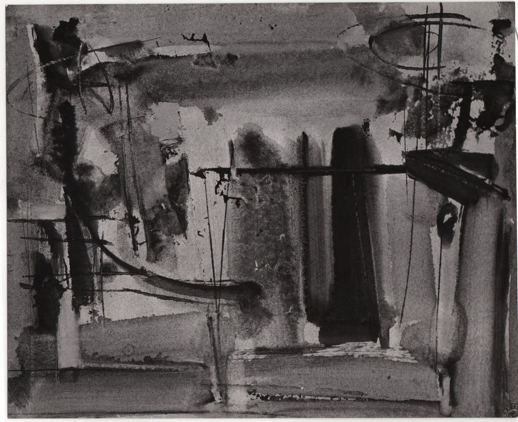 Φωτογραφία, α/μ, φωτογραφικό χαρτί, 12,0×15,0 εκ. Αναπαραγωγή του έργου του Γιάννη Σπυρόπουλου “Σύνθεση σε γκρι”, 1959. Στην πίσω όψη, σημείωση με τα στοιχεία του έργου και σφραγίδα του φωτογράφου Μάκη Σκιαδαρέση.