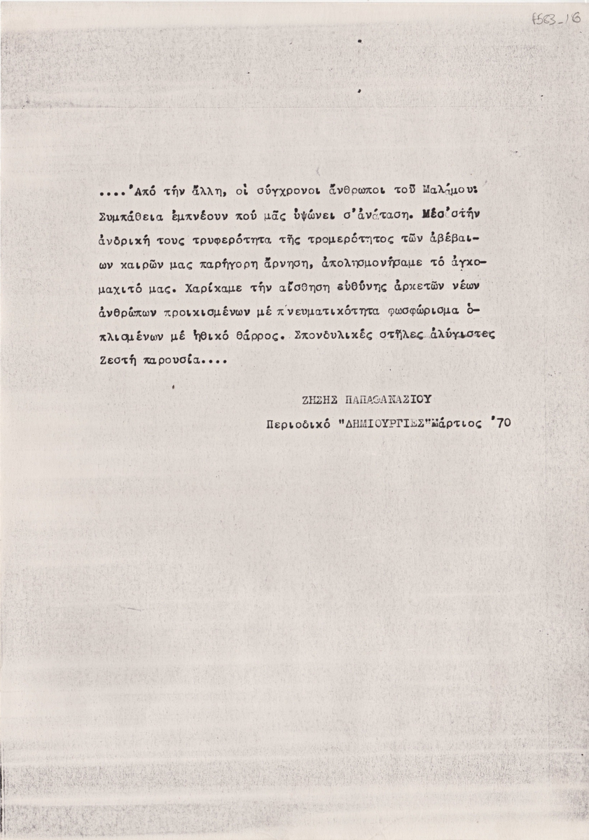 Φωτοαντίγραφο κειμένου, στα ελληνικά, δακτυλόγραφο, χαρτί, 29,8×21,0 εκ. Κριτική του Ζήση Παπαθανασίου για την απόδοση της ανθρώπινης μορφής στο έργο του Κώστα Μαλάμου.