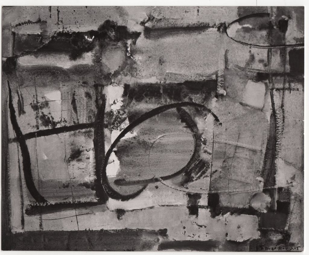 Φωτογραφία, α/μ, φωτογραφικό χαρτί, 12,0×15,0 εκ. Αναπαραγωγή του έργου του Γιάννη Σπυρόπουλου “Ο φάρος”, 1959. Στην πίσω όψη, σημείωση με τα στοιχεία του έργου και σφραγίδα του φωτογράφου Μάκη Σκιαδαρέση.