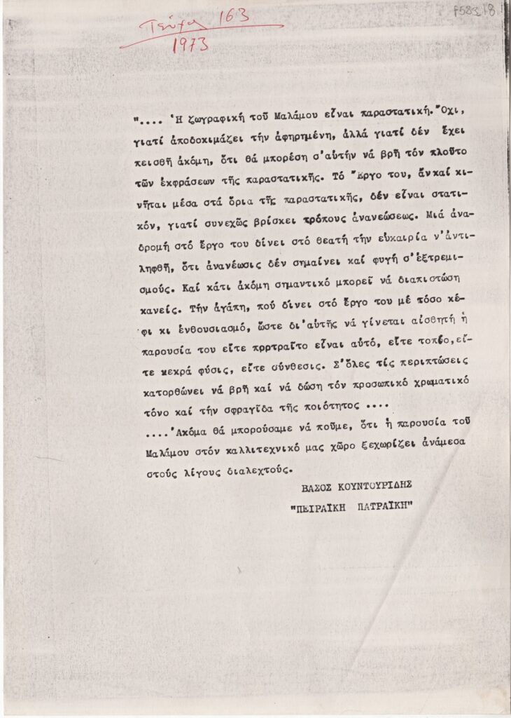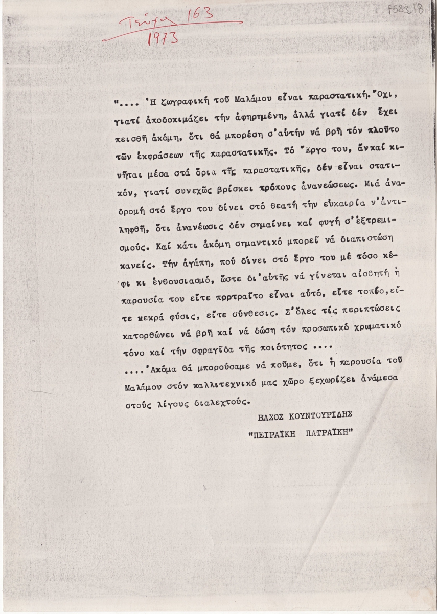 Φωτοαντίγραφο κειμένου, δακτυλόγραφο, στα ελληνικά, χαρτί, 29,8×21,0 εκ. Απόσπασμα του Βάσου Κουντουρίδη για τον ζωγράφο Κώστα Μαλάμο. Επάνω, επιγραφή με τα στοιχεία της δημοσίευσης.