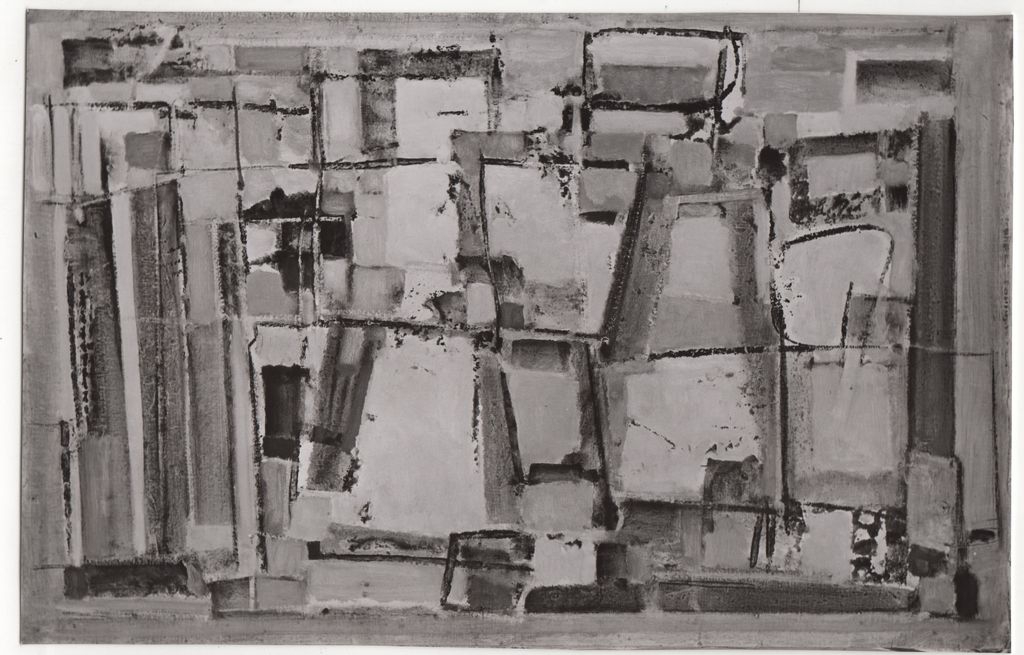 Φωτογραφία, α/μ, φωτογραφικό χαρτί, 11,0×17,0 εκ. Αναπαραγωγή του έργου του Γιάννη Σπυρόπουλου “Νησί του Αιγαίου”, 05/1959. Στην πίσω όψη, σημείωση με τα στοιχεία του έργου και σφραγίδα του φωτογράφου Μάκη Σκιαδαρέση.