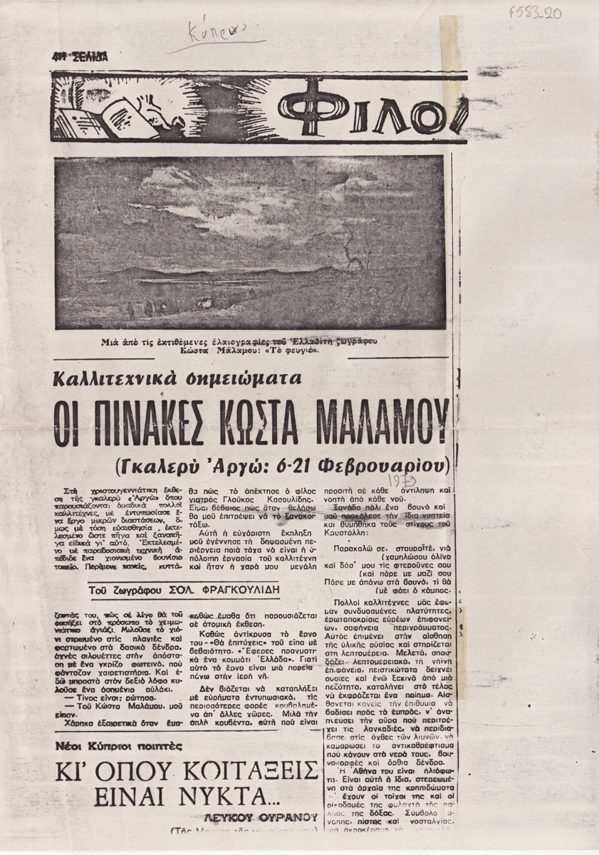 Φωτοαντίγραφο αποκόμματος, στα ελληνικά, χαρτί, 29,8×21,0 εκ. Κριτική του ζωγράφου Σολωμού Φραγκουλίδη για την ατομική έκθεση ζωγραφικής του Κώστα Μαλάμου στη Λευκωσία το 1973. Εικονογραφείται με αναπαραγωγή έργου.