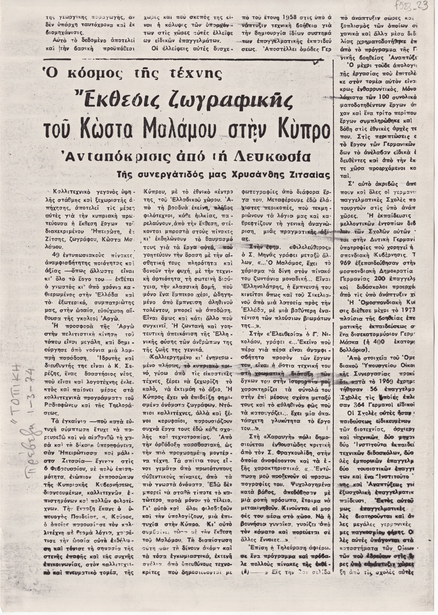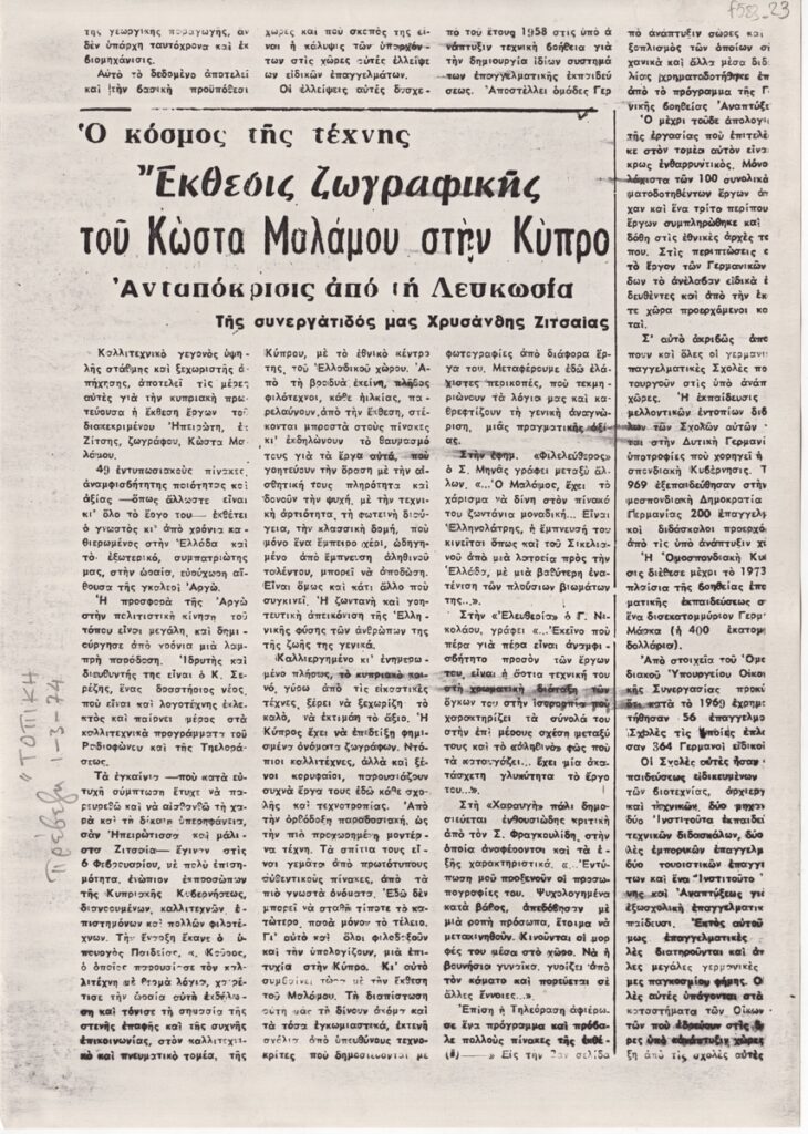 Φωτοαντίγραφο αποκόμματος, στα ελληνικά, χαρτί, 29,8×21,0 εκ. Κριτική της Χρυσάνθης Ζιτσαία για την ατομική έκθεση ζωγραφικής του Κώστα Μαλάμου στην Λευκωσία το 1973. Αριστερά, επιγραφή με τα στοιχεία της δημοσίευσης.
