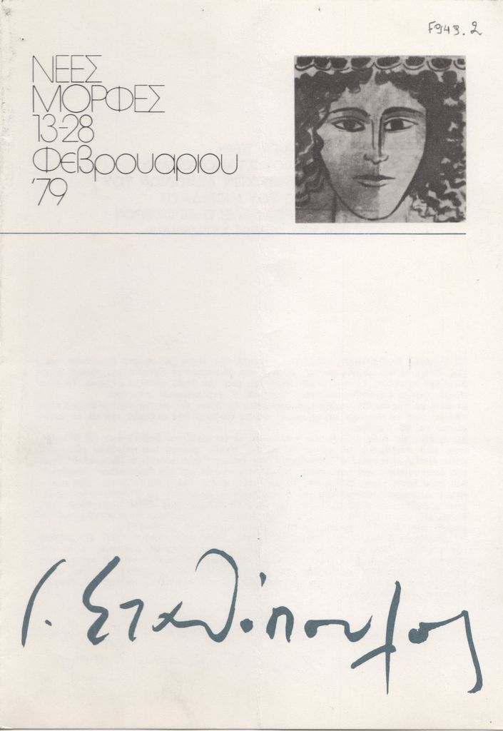 Έντυπο, δίπτυχο, στα ελληνικά, χαρτόνι, 20,0×14,0 εκ.. Έντυπο της ατομικής ατομικής έκθεσης ζωγραφικής του Γιώργου Σταθόπουλου στην Αθήνα το 1979. Περιέχει κριτικό σημείωμα του συνθέτη Μάνου Χατζηδάκι με τίτλο “Ολίγα περί του ζωγράφου Γιώργου Σταθόπουλου και περί των μοναχικών ασχολιών του στην οδό του Μιθριδάτη κι όταν τον προσκαλεί ο Αιγόκερος σε μια νυχτερινή συνομιλία”.