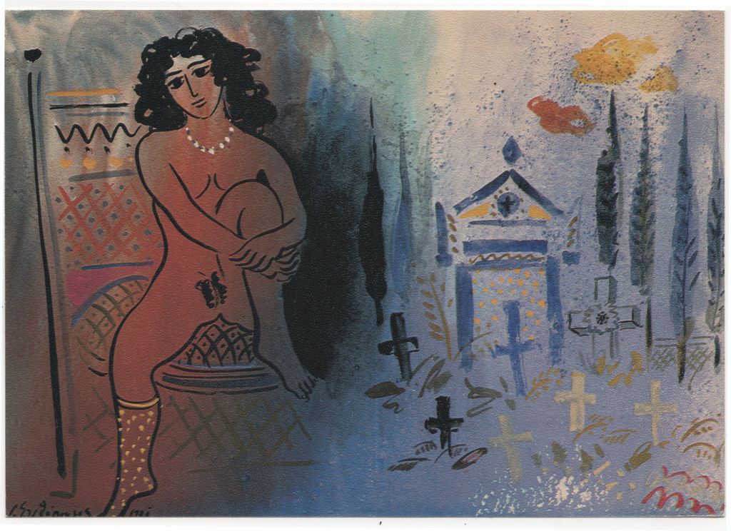 Έντυπο, μονόφυλλο, στα ελληνικά, από χαρτόνι, 13,3×19,0 εκ.. Πρόσκληση της ατομικής έκθεσης ζωγραφικής του Γιώργου Σταθόπουλου στην Αθήνα το 1982. Στη μία όψη, εικονογράφηση. Στην πίσω όψη, χειρόγραφη σημείωση με τα στοιχεία του Τώνη Σπητέρη ως παραλήπτη και σφραγίδα ταχυδρομείου.