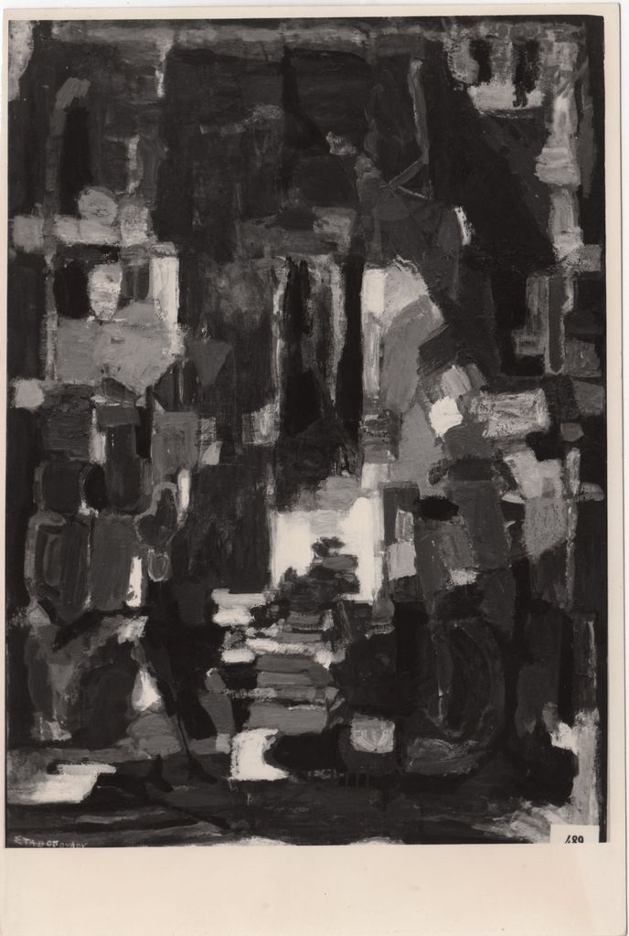Φωτογραφία, α/μ, φωτογραφικό χαρτί, 18,0×12,0 εκ. Αναπαραγωγή έργου της Ελένης Σταθοπούλου. Στην πίσω όψη, επιγραφή με τα στοιχεία του έργου και σφραγίδα του Φωτογραφικού Εργαστηρίου Κατ. Κωνσταντόπουλου.