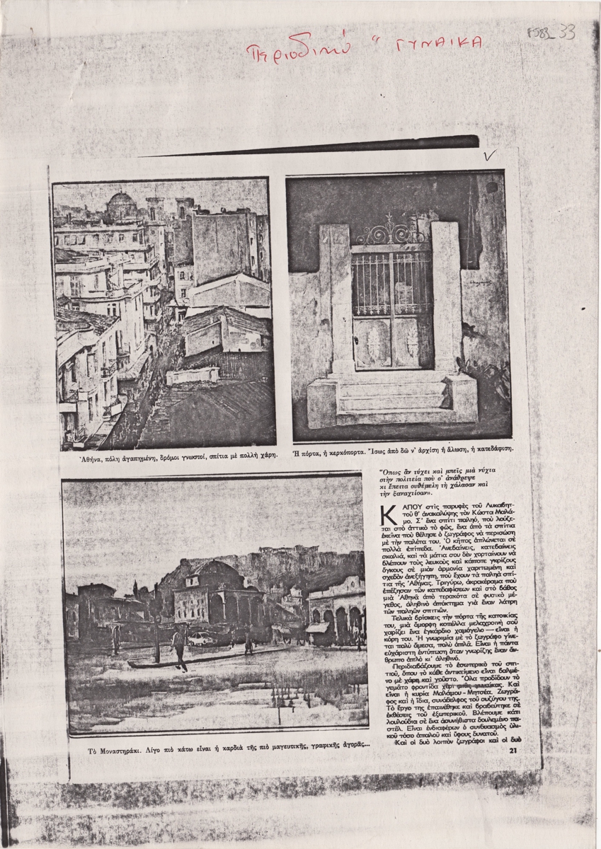 Φωτοαντίγραφο αποκόμματος περιοδικού, στα ελληνικά, χαρτί, 29,8×21,0 εκ. Άρθρο της Βεατρίκης Σπηλιάδη για τον ζωγράφο Κώστα Μαλάμο. Περιέχει αποσπάσμα συνέντευξης του καλλιτέχνη. Εικονογραφείται με αναπαραγωγή έργων και φωτογραφίας του καλλιτέχνη.