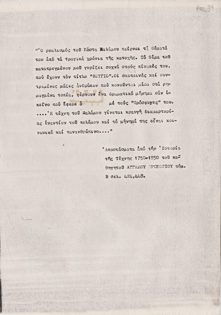 Φωτοαντίγραφο κειμένου, στα ελληνικά, δακτυλόγραφο, χαρτί, 29,8×21,0 εκ. Απόσπασμα του κειμένου του Αγγέλου Προκοπίου για τον ζωγράφο Κώστα Μαλάμο από τον Β τόμο του έργου του “Ιστορίας της Τέχνης 1750-1950”.