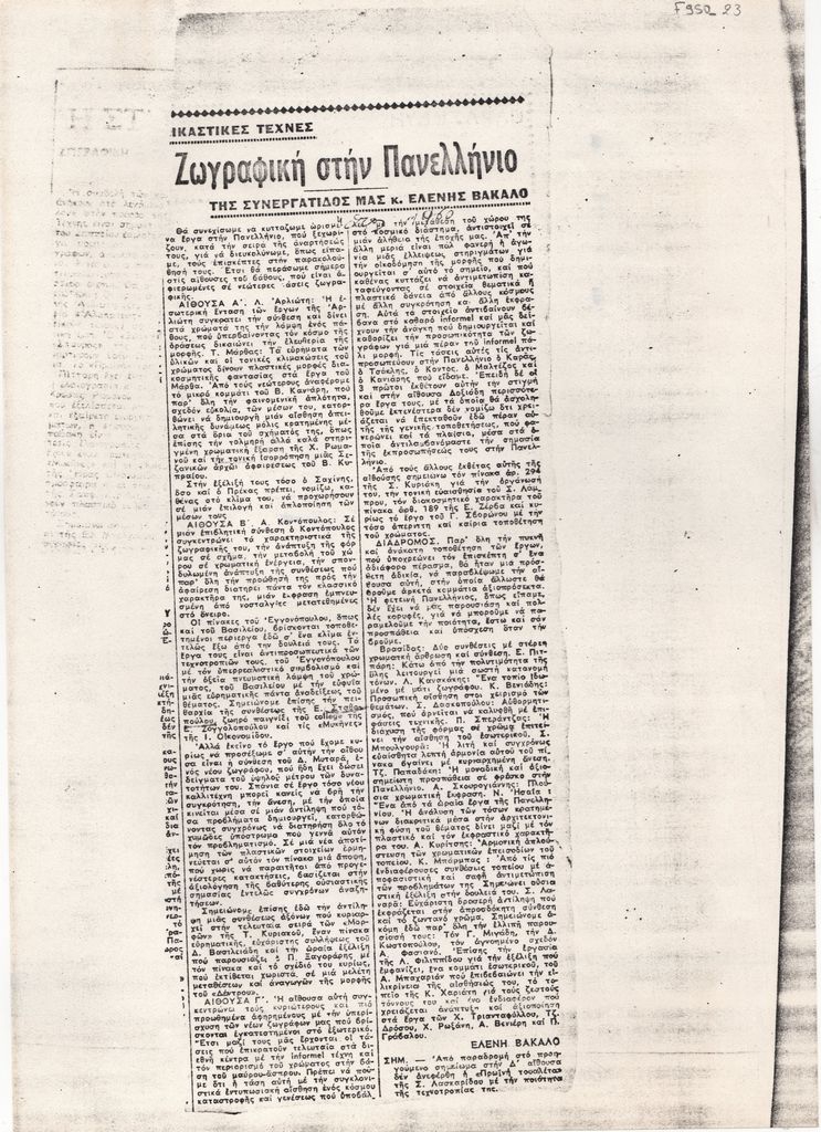 Φωτοαντίγραφο αποκόμματος, έντυπο, χαρτί, 29,8×21,0 εκ., όπου δημοσιεύεται, στα ελληνικά, κρτική της Ελένης Βακαλό για την Πανελλήνιο Έκθεση του 1960. Χειρόγραφες σημειώσεις.