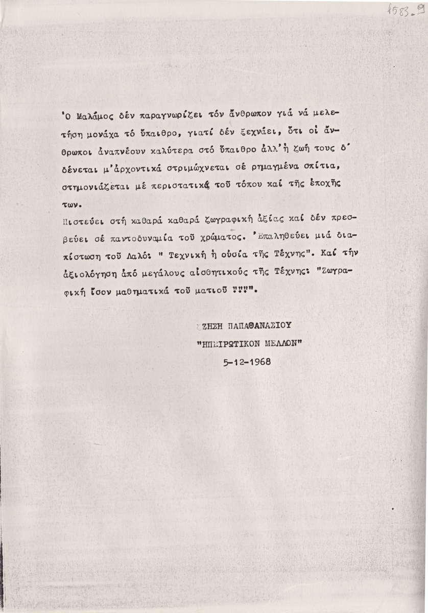 Φωτοαντίγραφο κειμένου, δακτυλόγραφο, στα ελληνικά, χαρτί, 29,5×21,0 εκ. Απόσπασμα κριτικής του Ζήση Παπαθανασίου για τον ζωγράφο Κώστα Μαλάμο.
