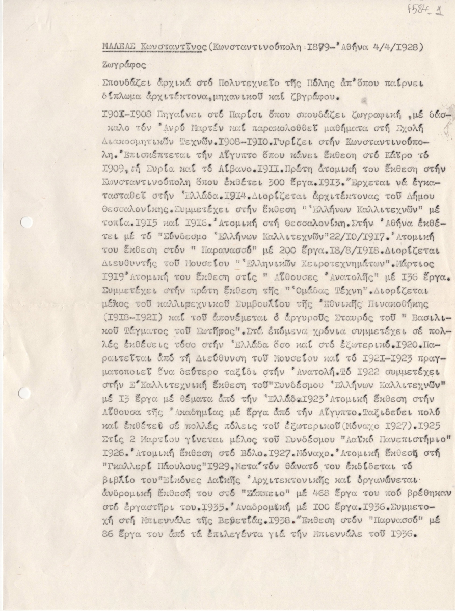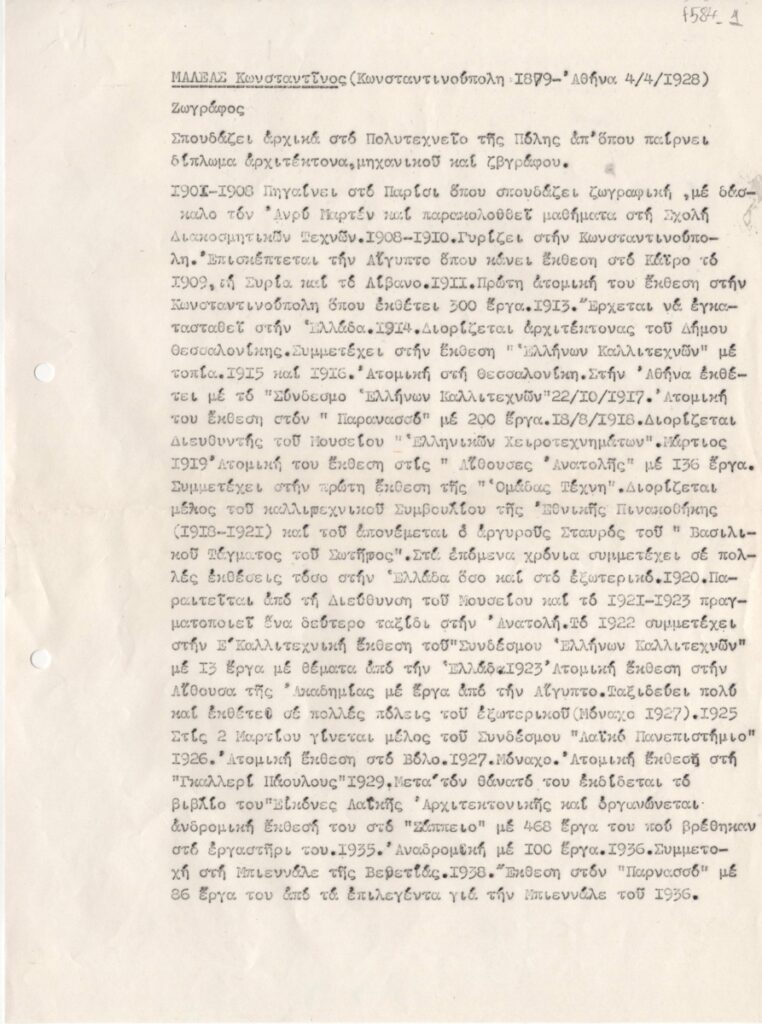 Κείμενο, δακτυλόγραφο, στα ελληνικά, χαρτί, 28,8×21,4 εκ. Βιογραφικό σημείωμα του Κωνσταντίνου Μαλέα με ιδιαίτερη αναφορά στις σπουδές του, τις ατομικές και ομαδικές εκθέσεις στις οποίες συμμετείχε και τα βραβεία του.