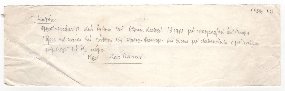 Κείμενο, χειρόγραφο, με μολύβι, στα ελληνικά, σε απόκομμα χαρτιού, 6,2×21,3 εκ. Απόσπασμα άρθρου του Ζ. Παπαντωνίου για τον ζωγράφου Κωνσταντίνο Μαλέα.