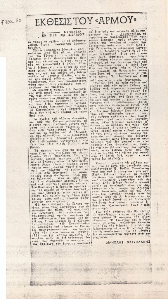 Φωτοαντίγραφο αποκόμματος , έντυπο, χαρτί, 19,5×10,0 εκ., όπου δημοσιεύεται, στα ελληνικά, απόσπασμα κριτικής του Μανόλη Χατζηδάκη για την ομαδική έκθεση της ομάδας “Αρμός” στο Ζάππειο.