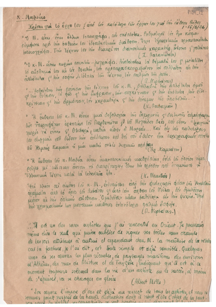 Κείμενο, χειρόγραφο, με πράσινο μελάνι, στα ελληνικά και γαλλικά, χαρτί, 30,2×21,0 εκ. Αποδελτίωση κριτικών διαφόρων συγγραφέων για το έργο του ζωγράφου Κωνσταντίνου Μαλέα από τον κατάλο των έργων του για την έκθεση στον Βόλο το 1926.