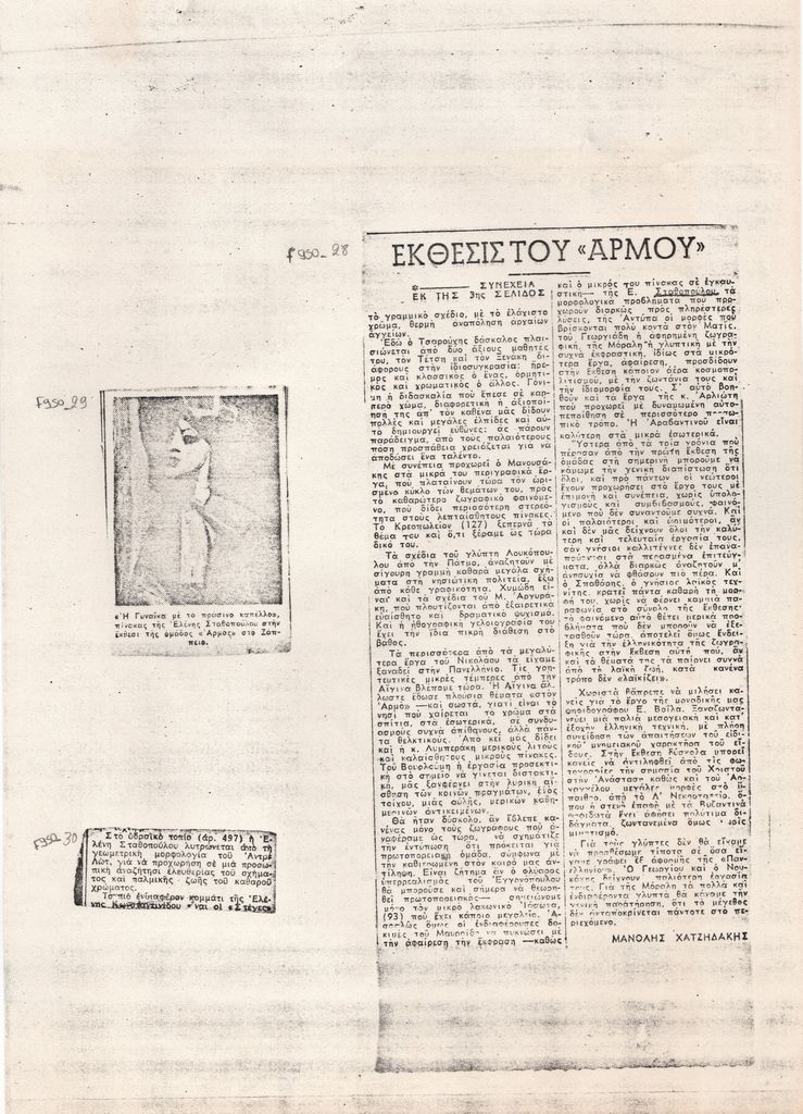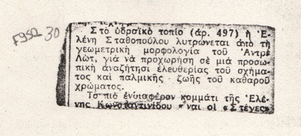 Φωτοαντίγραφο αποκόμματος, έντυπο, χαρτί, 2,5×5,5 εκ., όπου δημοσιεύεται, στα ελληνικά, απόσπασμα κριτικής της παρουσίας της Ελένης Σταθοπούλου στην έκθεση της ομάδας Αρμός στο Ζάππειο.