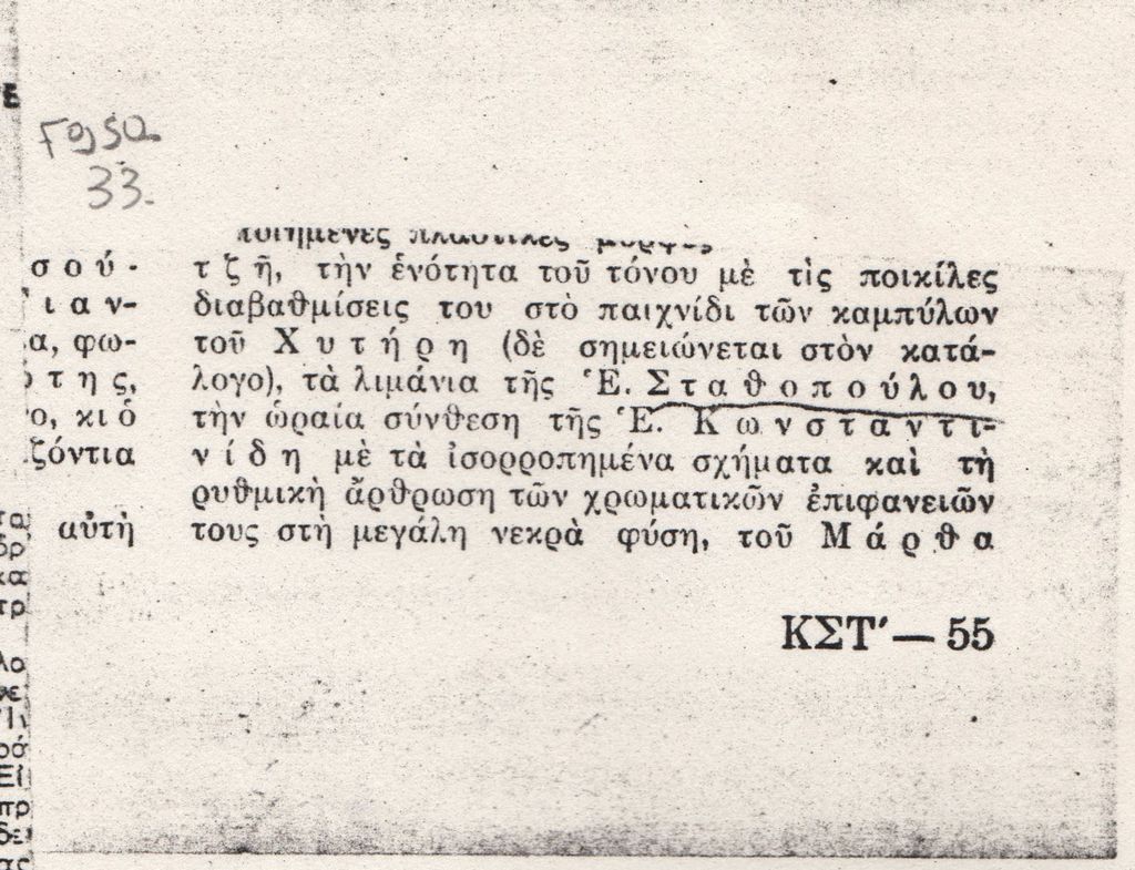 Απόκομμα, έντυπο, χαρτί, 5,0×7,5 εκ., όπου δημοσιεύεται, στα ελληνικά, απόσπασμα κριτικής Πανελληνίου Έκθεσης.