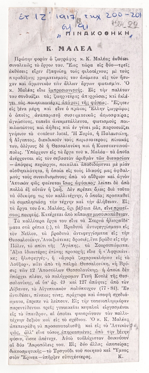 Φωτοαντίγραφο αποκόμματος περιοδικού, στα ελληνικά, χαρτί, 29,6×8,1 εκ. Κριτική της πρώτης ατομικής έκθεσης του ζωγράφου Κωνσταντίνου Μαλέα στην Αθήνα το 1917. Επάνω, επιγραφή με τα στοιχεία δημοσίευσης.