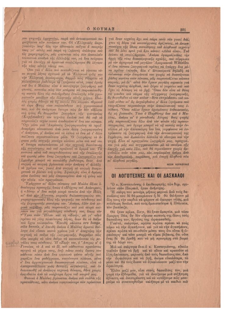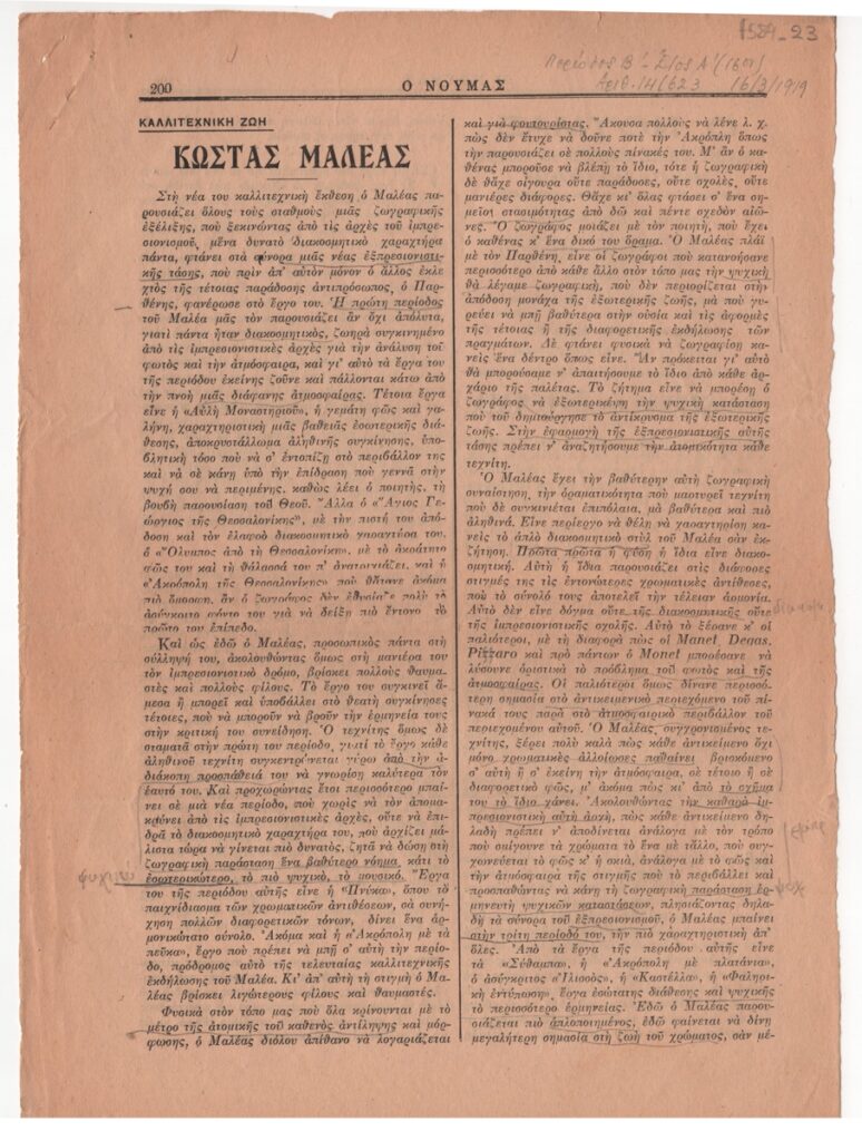 Απόκομμα περιοδικού, στα ελληνικά, χαρτί, 2 φφ., 30,5×21,7 εκ. Κριτική του Λέοντα Κουκούλα για ατομική έκθεση ζωγραφικής του Κώστα Μαλέα στην Αθήνα το 1919. Στην επιφάνεια του κειμένου σημειώσεις και υπογραμμίσεις. Επάνω, επιγραφή με τα στοιχεία της δημοσίευσης.