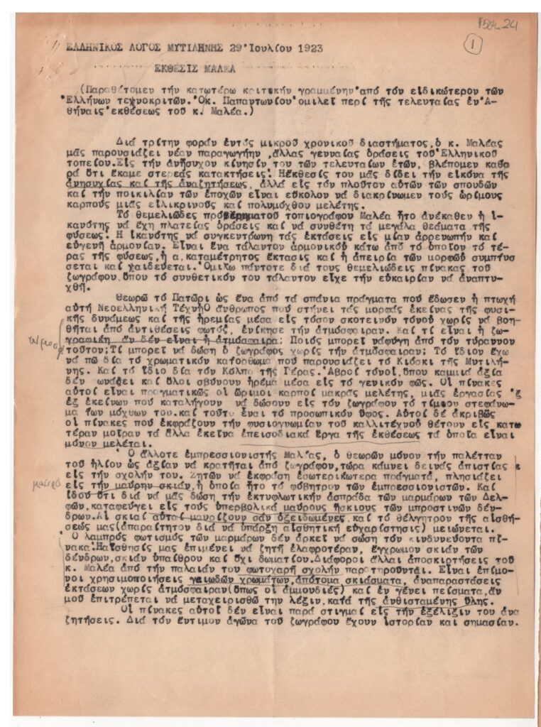Κείμενο, δακτυλόγραφο, στα ελληνικά, χαρτί, 2 φφ., 29,0×21,2 εκ. Αποδελτίωση της κριτικής του Ζ. Παπαντωνίου για την ατομική έκθεση ζωγραφική του Κωνσταντίνου Μαλέα στην Αθήνα το 1923, από το περιοδικό “Ελληνικός Λόγος” Μυτιλήνης. Το κείμενο φέρει υπογραμμίσεις και σημειώσεις.