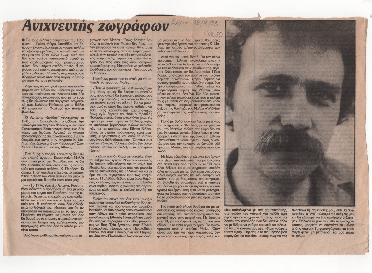Απόκομμα, έντυπο, χαρτί, 20,5×31,0 εκ., όπου δημοσιεύεται, στα ελληνικά, συνέντευξη του Αντώνη Κωτίδη με αφορμή την ολοκλήρωση της διδακτορικής του διατριβής για τον ζωγράφο Κωνσταντίνο Μαλέα στη Φιλοσοφική Σχολή του Πανεπιστημίου της Αθήνας. Στην συνέντευξη αναφέρεται στο λόγο που τον οδήγησαν στην επιλογή του Κ. Μαλέα ως θέμα της διατριβής του και τις δυσκολίες που συνάντησε στην έρευνά του. Εικονογραφείται με αναπαραγωγή φωτογραφίας του Α. Κωτίδη. Δίπλα στον τίτλο επιγραφή με τα στοιχεία δημοσίευσης.