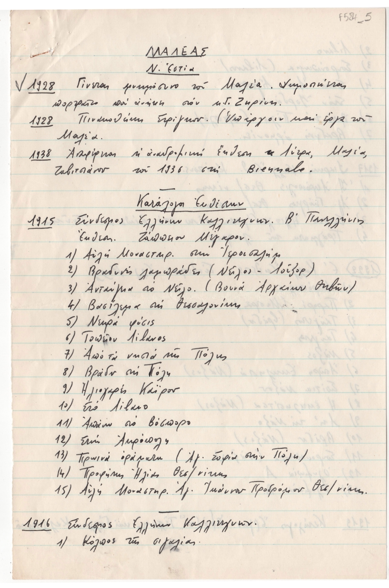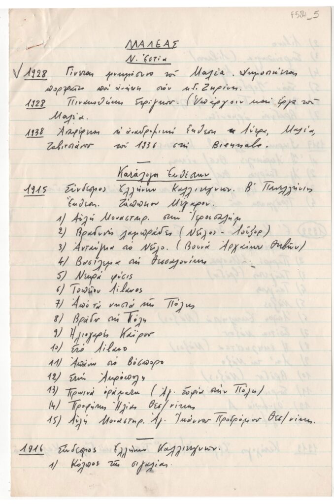Κείμενο, χειρόγραφο, με μπλε μελάνι, χαρτί, 2 φφ., 29,8×19,5 εκ. Αποδελτίωση πληροφοριών για τον ζωγράφο Κωνσταντίνο Μαλέα. Περιλαμβάνονται σύντομα βιογραφικά στοιχεία και κατάλογος εκθέσεων από το 1915 έως το 1938.
