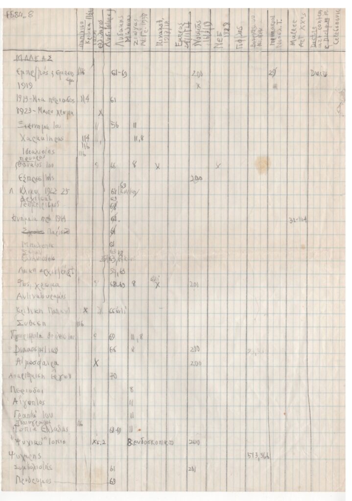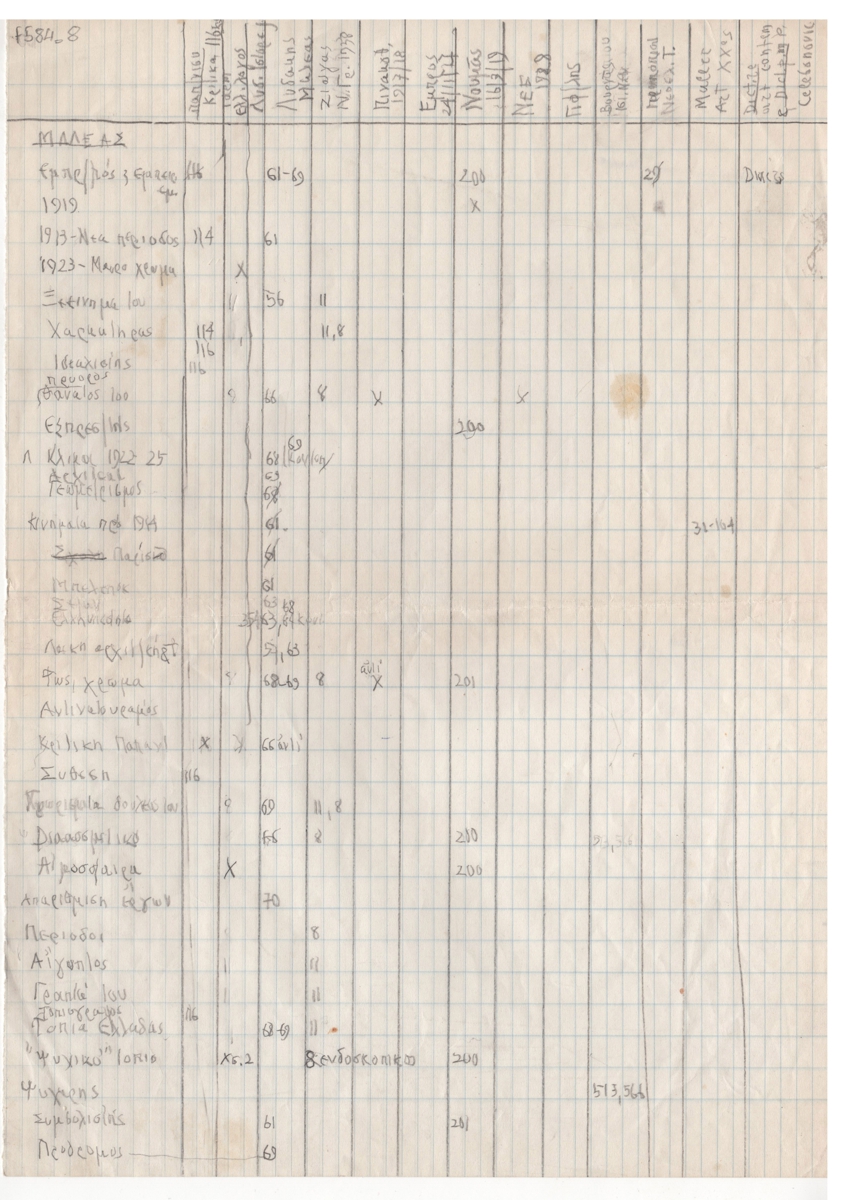 Πίνακας, χειρόγραφος, με μολύβι, στα ελληνικά, χαρτί, 29,3×21,0 εκ. Βιβλιογραφικός πίνακας με αναφορές διαφόρων στοιχείων για το έργο του Κωνσταντίνου Μαλέα σε διάφορες βιβλιογραφικές πηγές.