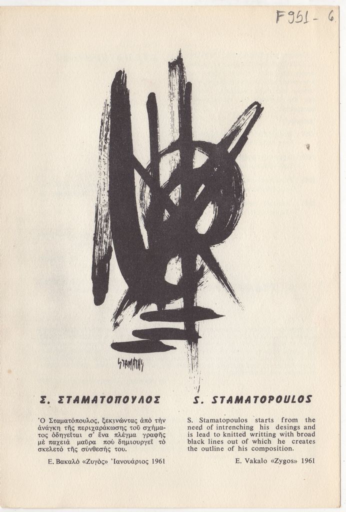 Έντυπο, χαρτόνι διπλής όψης, 21×14,5 εκ., στα ελληνικά και αγγλικά, έκθεσης του Σταμάτη Σταματόπουλου.