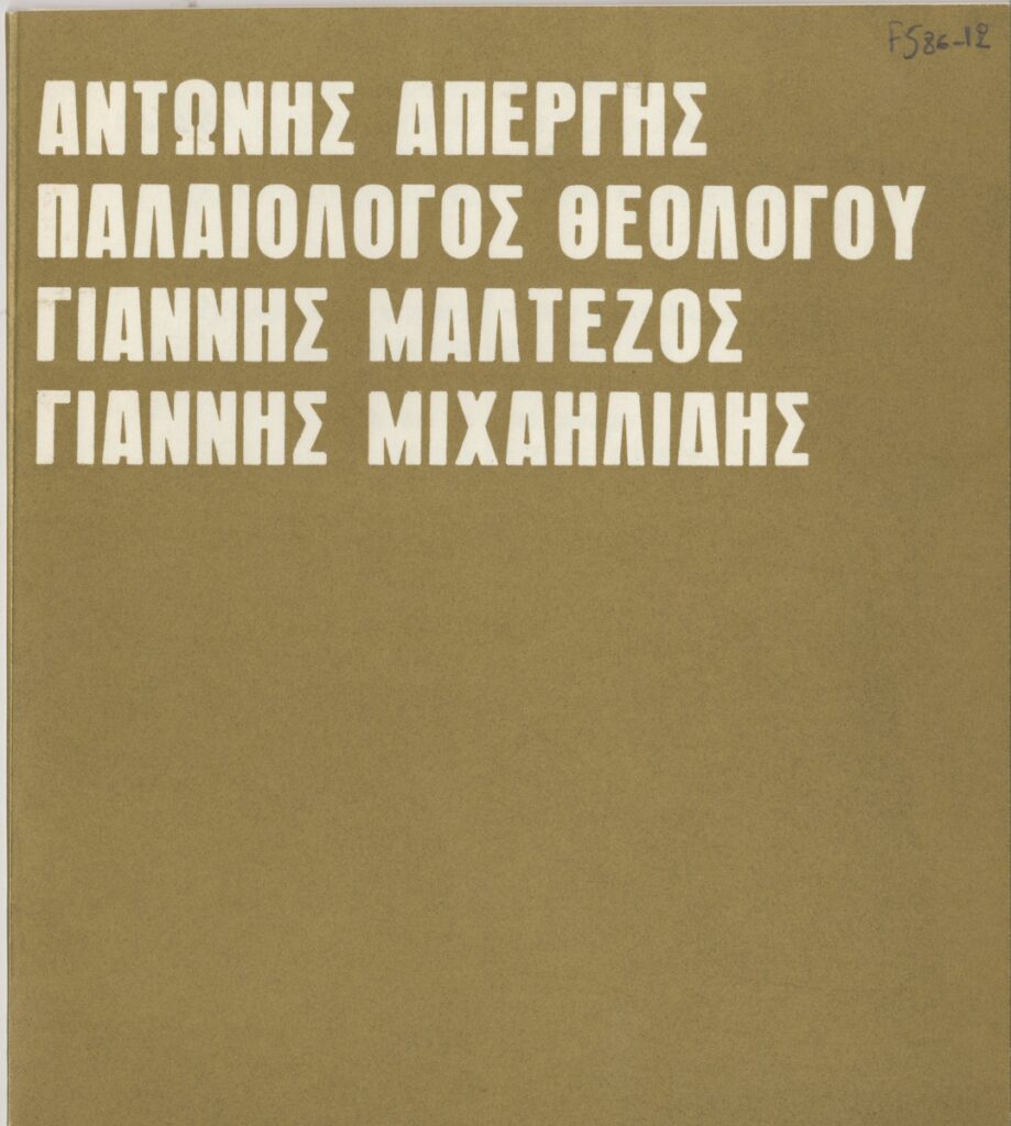 Κατάλογος, χαρτί ιλλουστρασιόν, 18 φφ, 19×17 εκ., στα ελληνικά, ομαδικής έκθεσης ζωγραφικής των Αντώνη Απέργη, Παλαιολόγου Θεολόγου, Γιάννη Μαλτέζου και Γιάννη Μιχαηλίδη. Το έντυπο περιέχει κείμενα για το έργο των καλλιτεχνών και εικονογράφηση.