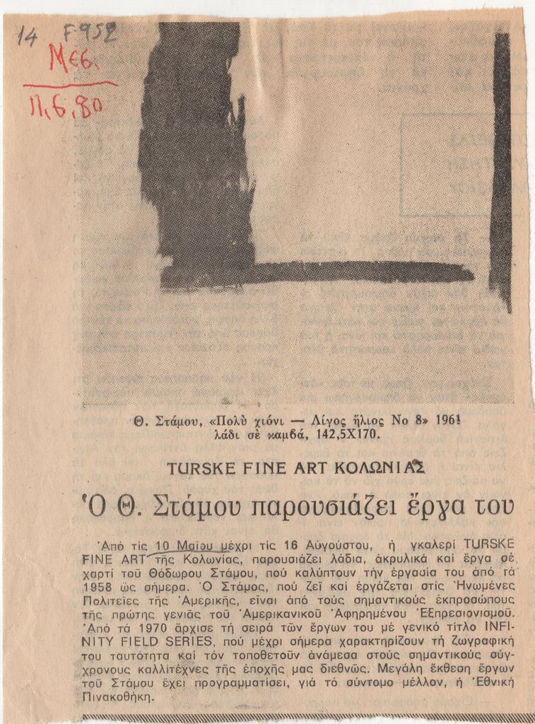 Απόκομμα, χαρτί, 12×15.5 εκ., στα ελληνικά, δημοσίευσης άρθρου αναφερόμενου σε έκθεση του Θεόδωρου Στάμου στην Turkse Fine Art Gallery στην Κολωνία.