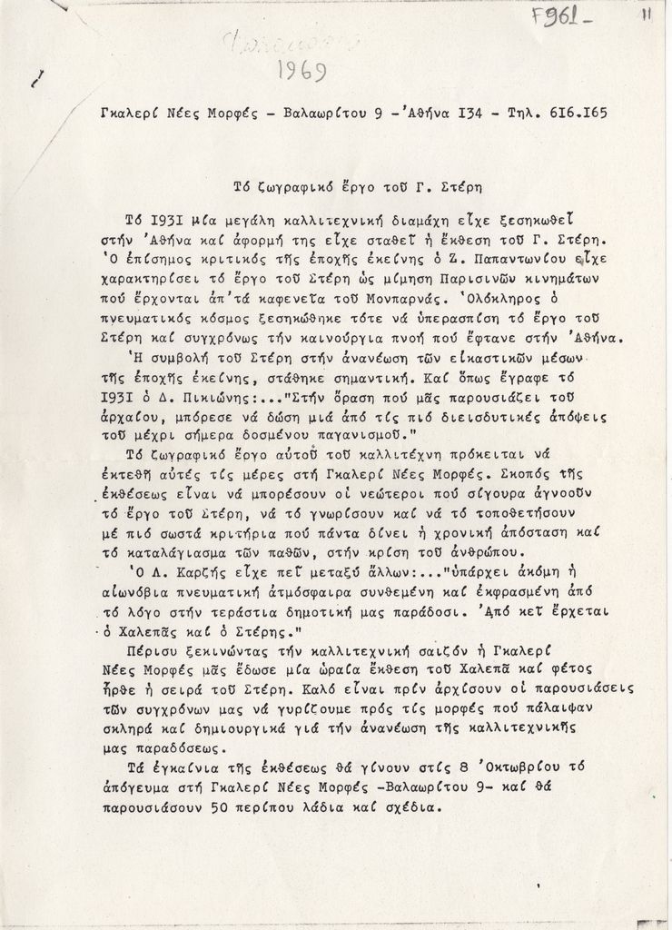 Δελτίο Τύπου, δακτυλόγραφο, χαρτί, 29,5×21 εκ., στα ελληνικά, έκθεσης του Γεράσιμου Στέρη. Δίνονται πληροφορίες για το έργο του με αποσπάσματα κριτικών.