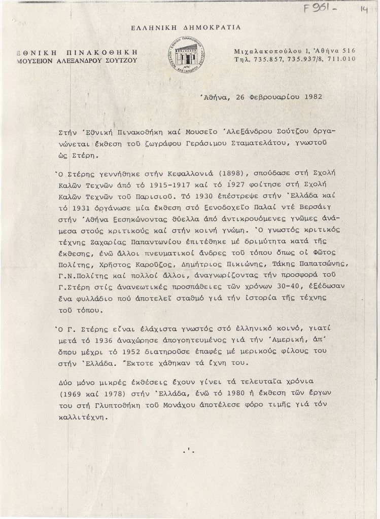 Φωτοαντίγραφο δελτίου Τύπου, δακτυλόγραφο, χαρτί, 2 φφ, 30×21 εκ., στα ελληνικά, έκθεσης του Γεράσιμου Στέρη, στην Εθνική Πινακοθήκη Αθηνών.