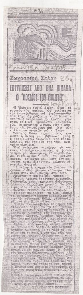 Φωτοαντίγραφο, χαρτί, 23×6,5 εκ., στα ελληνικά, δημοσίευσης κριτικής έκθεσης του Γεράσιμου Στέρη, η οποία διεξάγεται στη Θεσσαλονίκη.