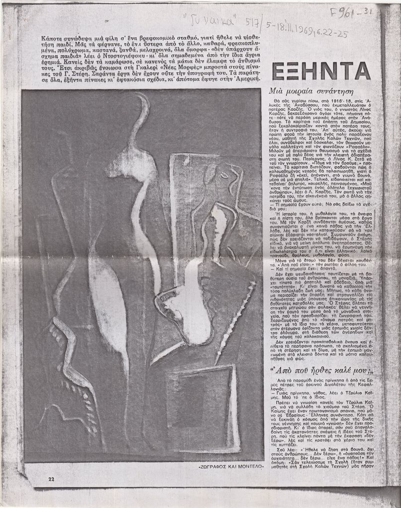Φωτοαντίγραφο, χαρτί, 32×26 εκ., 4 φφ, στα ελληνικά, δημοσίευσης συνέντευξης του Λίνου Καρζή, στην οποία αναφέρεται στη ζωή και στο εικαστικό έργο του Γεράσιμου Στέρη. Η συνέντευξη έγινε με αφορμή έκθεση έργων του καλλιτέχνη στην γκαλερί Νέες Μορφές στην Αθήνα.