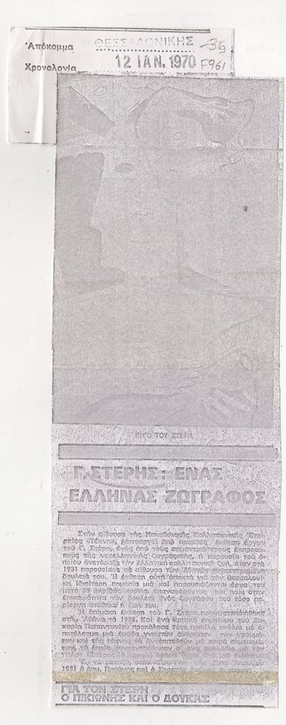 Φωτοαντίγραφο, χαρτί, 2 φφ, ακανόνιστου μεγέθους, στα ελληνικά, δημοσίευσης κριτικής έκθεσης του Γεράσιμου Στέρη, η οποία διεξάγεται στην Μακεδονική Καλλιτεχνική Εταιρεία “Τέχνη” στη Θεσσαλονίκη.