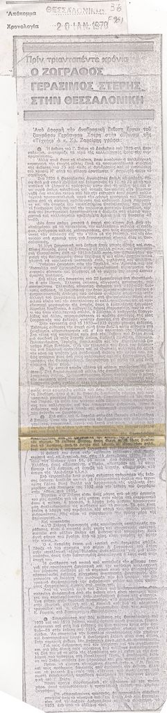 Φωτοαντίγραφο, χαρτί ακανόνιστου μεγέθους, στα ελληνικά, δημοσιεύματος στην εφημερίδα “Θεσσαλονίκη” κριτικής έκθεσης του Γεράσιμου Στέρη, στην Μακεδονική Καλλιτεχνική Εταιρεία Τέχνη στη Θεσσαλονίκη. Δίνονται κριτικές για το έργο του και γίνεται αναφορά σε προηγούμενες εκθέσεις του καλλιτέχνη.