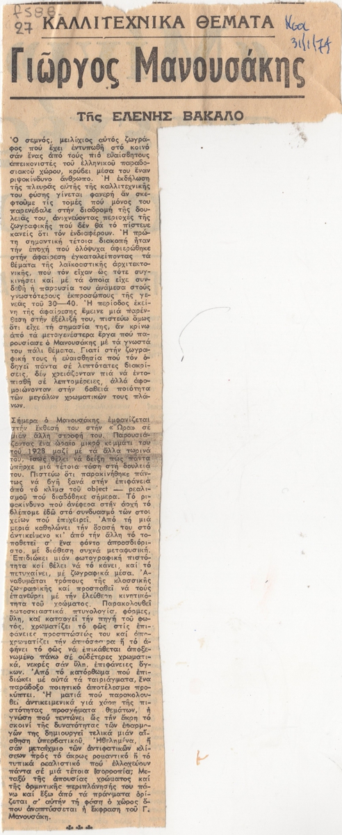 Απόκομμα, χαρτί, 24,5×10 εκ., στα ελληνικά, δημοσίευσης κριτικής έκθεσης του Γιώργου Μανουσάκη, η οποία διεξάγεται στο Καλλιτεχνικό Πνευματικό Κέντρο Ώρα στην Αθήνα. Εντάσσεται στη στήλη “Καλλιτεχνικά Θέματα” του εντύπου.