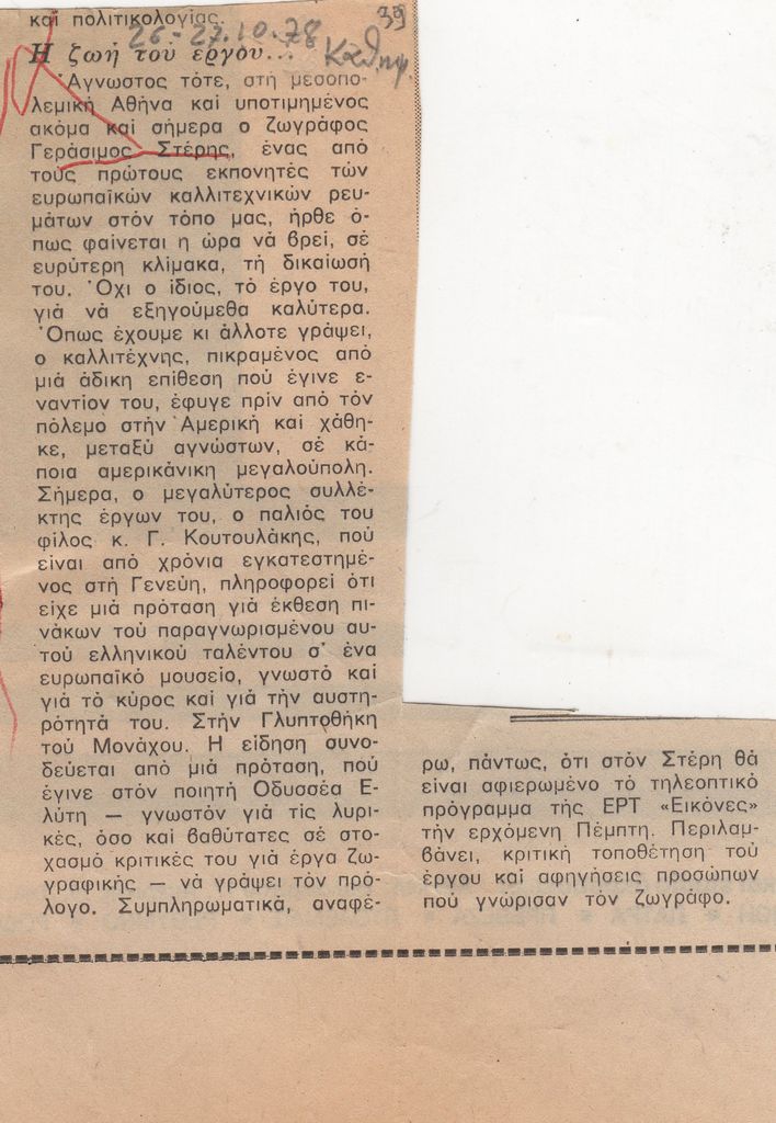 Απόκομμα, χαρτί ακανόνιστου μεγέθους, στα ελληνικά, δημοσίευσης άρθρου αναφερόμενου στο εικαστικό έργο του ΓεράσιμοΥ Στέρη, με αφορμή προβολή τηλεοπτικού προγράμματος της ΕΡΤ αφιερωμένου στον καλλιτέχνη.