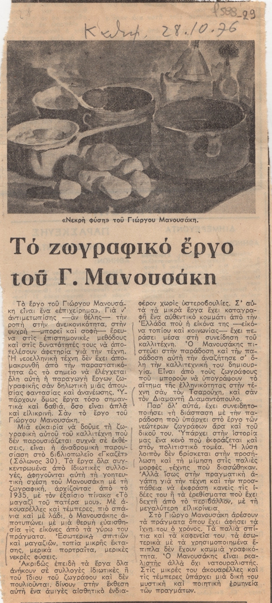 Απόκομμα, χαρτί, 24×11 εκ., στα ελληνικά, δημοσίευσης κριτικής έκθεσης του Γιώργου Μανουσάκη, η οποία διεξάγεται στο βιβλιοπωλείο “Γκαζέτ” στην Αθήνα.