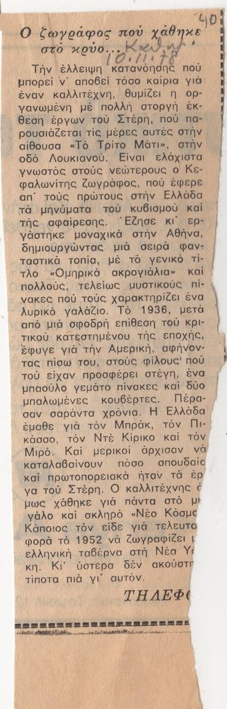 Απόκομμα, χαρτί, 18×5,5 εκ., στα ελληνικά, δημοσίευσης κριτικής έκθεσης του Γεράσιμου Στέρη, που διεξάγεται στο Τρίτο Μάτι στην Αθήνα.