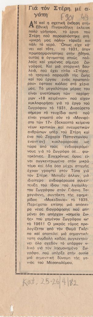 Απόκομμα, χαρτί, 22,5×7 εκ., στα ελληνικά, δημοσίευσης κριτικής έκθεσης έργων του Γεράσιμου Στέρη, η οποία διεξάγεται στην Εθνική Πινακοθήκη Αθηνών.