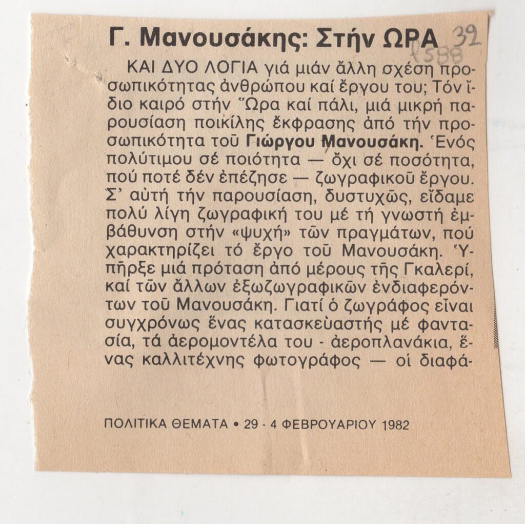 Απόκομμα, χαρτί, 2 φφ, 7,5×7,5 και 8×6 εκ., στα ελληνικά, δημοσίευσης κριτικής έκθεσης του Γιώργου Μανουσάκη, η οποία διεξάγεται στο Καλλιτεχνικό Πνευματικό Κέντρο Ώρα στην Αθήνα.