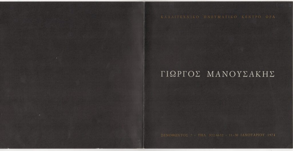 Έντυπο, χαρτόνι αναδιπλωμένο, 20×20 εκ., στα ελληνικά, ατομικής έκθεσης ζωγραφικής του Γιώργου Μανουσάκη. Περιέχει λίστα έργων που εκτίθενται και κείμενο του καλλιτέχνη για το έργο του.