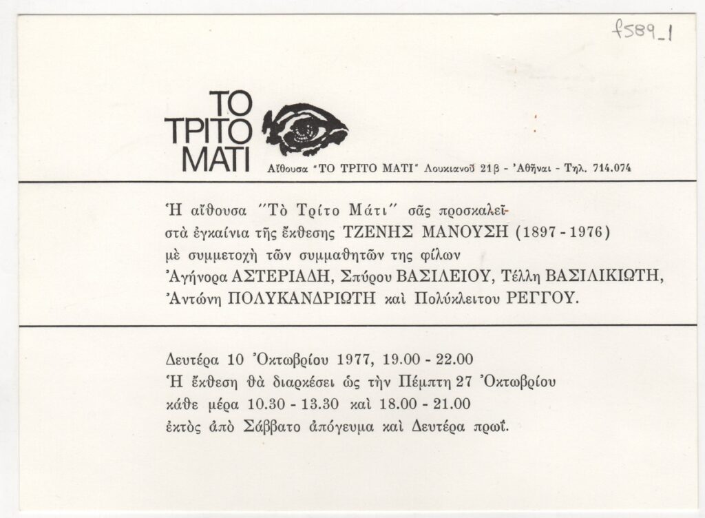 Πρόσκληση, χαρτόνι, 13,5×18,5 εκ., στα ελληνικά, ομαδικής έκθεσης της Τζένης Μανούση. Συμμετέχουν επίσης με έργα τους οι Αγήνορας Αστεριάδης, Σπύρος Βασιλείου, Τέλλης Βασιλικιώτης, Αντώνης Πολυκανδριώτης και Πολύκλειτος Ρέγκος.