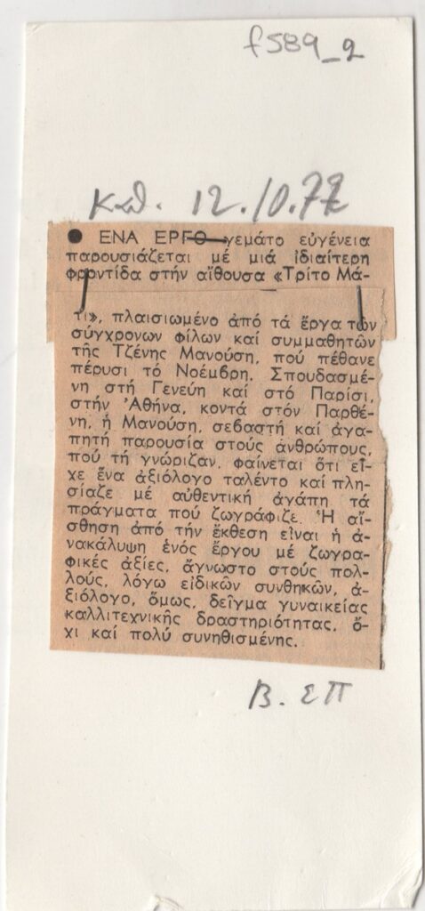 Απόκομμα, χαρτί, 2 φφ, συρραμμένο σε χαρτόνι, 13,5×6 εκ., στα ελληνικά, δημοσίευσης κριτικής έκθεσης της Τζένης Μανούση, η οποία διεξάγεται στην γκαλερί “Το Τρίτο Μάτι” στην Αθήνα. Στην κριτική δίνονται βιογραφικά στοιχεία και σχολιάζεται το έργο της καλλιτέχνιδας.