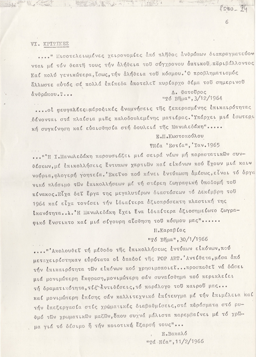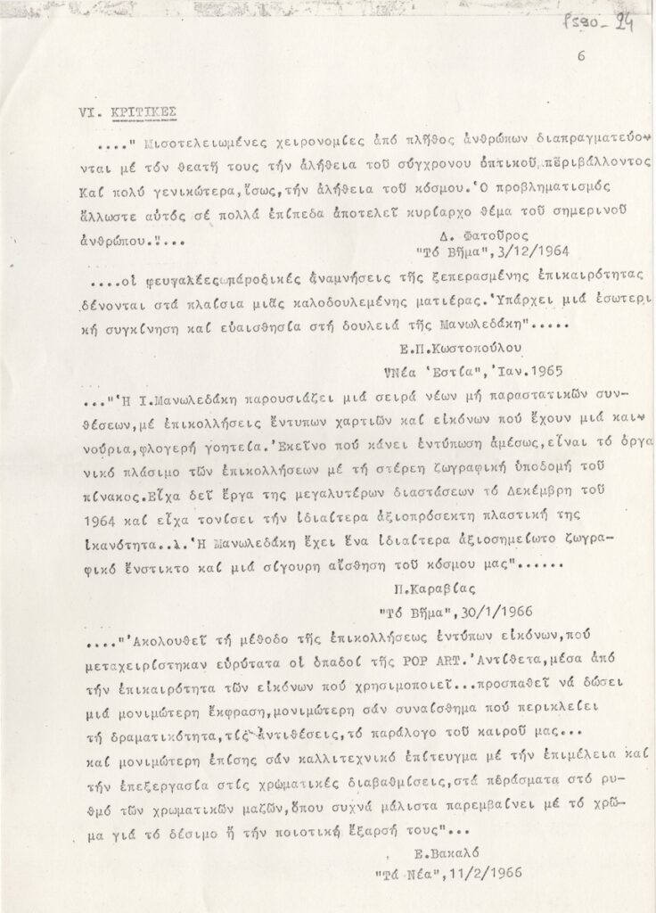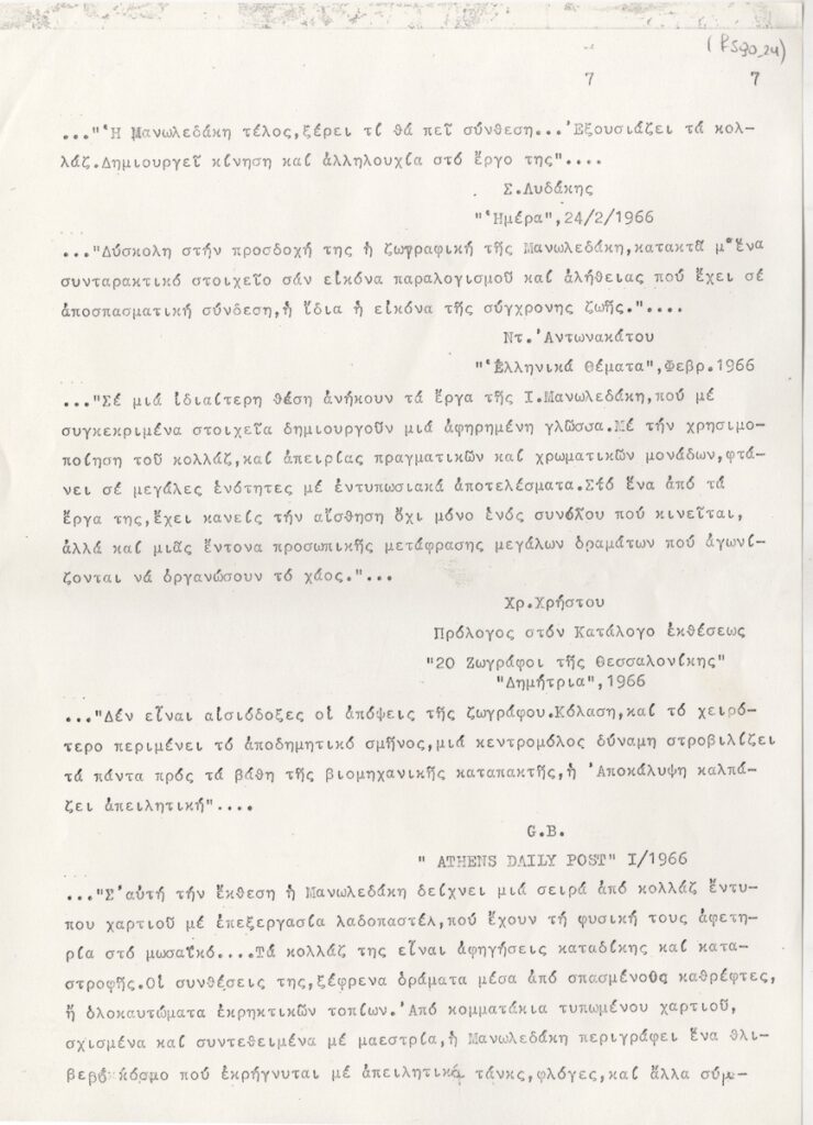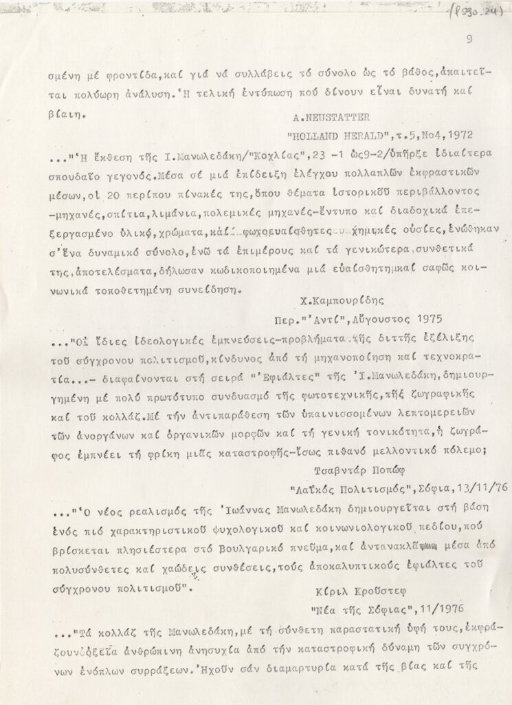 Φωτοαντίγραφο, χαρτί, 9 φφ, 29,5×21 εκ., στα ελληνικά, δημοσίευσης κριτικών για την Ιωάννα Μανωλεδάκη, από τον Ελληνικό και διεθνή Τύπο καθώς και αποσπάσματα κριτικών από καταλόγους εκθέσεων ως εξής: “Το Βήμα” (12/1964), “Νέα Εστία” (01/1965), “Το Βήμα” (01/1966), “Τα Νέα” (02/1966), “Ημέρα” (02/1966), “Ελληνικά Θέματα” (02/1966), “Athens Daily Post” (01/1966), “Sunday Times Advertizer” (02/1968), “State Signal” (02/1968), “Νέα Εποχή” (10/1971), “Holland Herald” (τόμος 5, τεύχος 4, 1972), “Αντί” (08/1975).