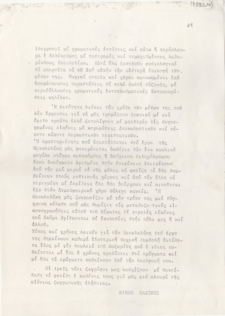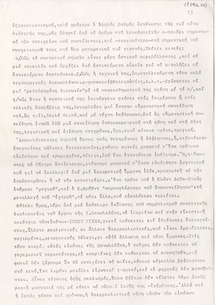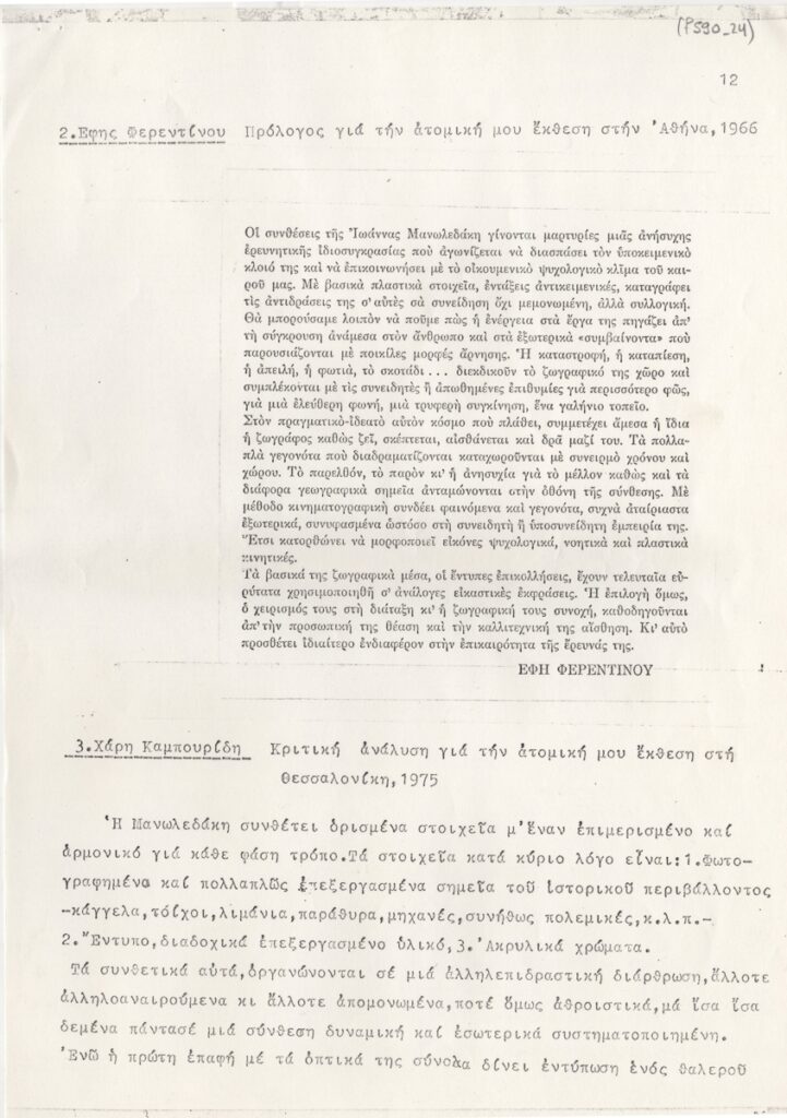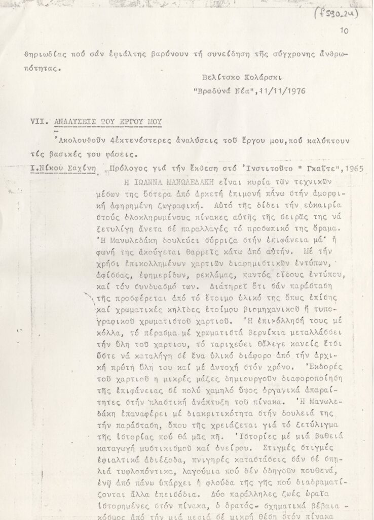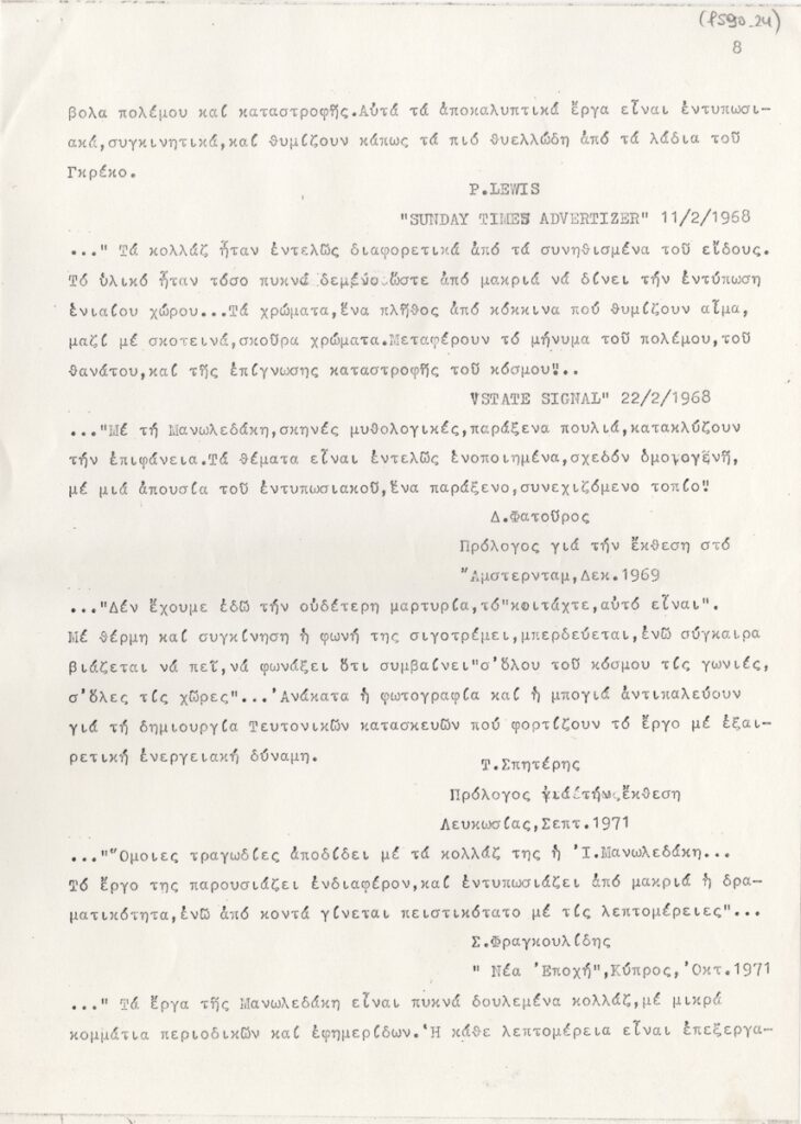 Φωτοαντίγραφο, χαρτί, 9 φφ, 29,5×21 εκ., στα ελληνικά, δημοσίευσης κριτικών για την Ιωάννα Μανωλεδάκη, από τον Ελληνικό και διεθνή Τύπο καθώς και αποσπάσματα κριτικών από καταλόγους εκθέσεων ως εξής: “Το Βήμα” (12/1964), “Νέα Εστία” (01/1965), “Το Βήμα” (01/1966), “Τα Νέα” (02/1966), “Ημέρα” (02/1966), “Ελληνικά Θέματα” (02/1966), “Athens Daily Post” (01/1966), “Sunday Times Advertizer” (02/1968), “State Signal” (02/1968), “Νέα Εποχή” (10/1971), “Holland Herald” (τόμος 5, τεύχος 4, 1972), “Αντί” (08/1975).